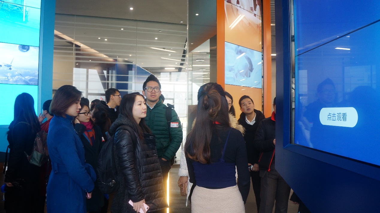 此次参访活动主要分为三个部分,首先同学们参观了GE北京科技园大堂展示区。展示区分为三个区域:“过去区”,“现在区”和“未来区”,覆盖航空,医疗,能源,数字化业务,运输等各个领域。过去的GE向社会提供了小至家用电器,大到钻井平台的各种服务;现在的GE为社会提供了飞机发动机、发电、能源管理、医疗解决方案、数字化等各方面的服务; 未来的GE将在清洁能源、可负担医疗、智慧城市等领域继续深掘。